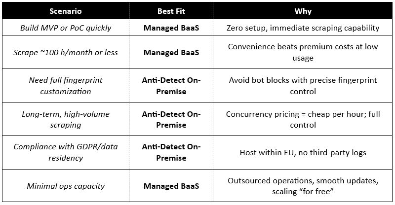 Opt for Anti-Detect On-Premise when your use case involves heavy scraping, complex fingerprint evasion, or strict compliance needs - especially if you can manage a bit of extra infrastructure work.