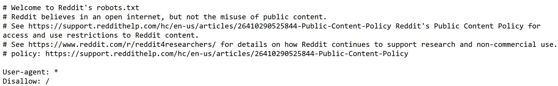 As you can see, Reddit’s robots.txt file is very strict, as it disallows crawling from any user agent. Looking directly at the robots.txt file is a way of verifying it, but what if you want to create an automation that parses it? In this case, you could use urllib.robotparser: A Python library that tells users about whether or not a particular user agent can fetch a URL on the target website.