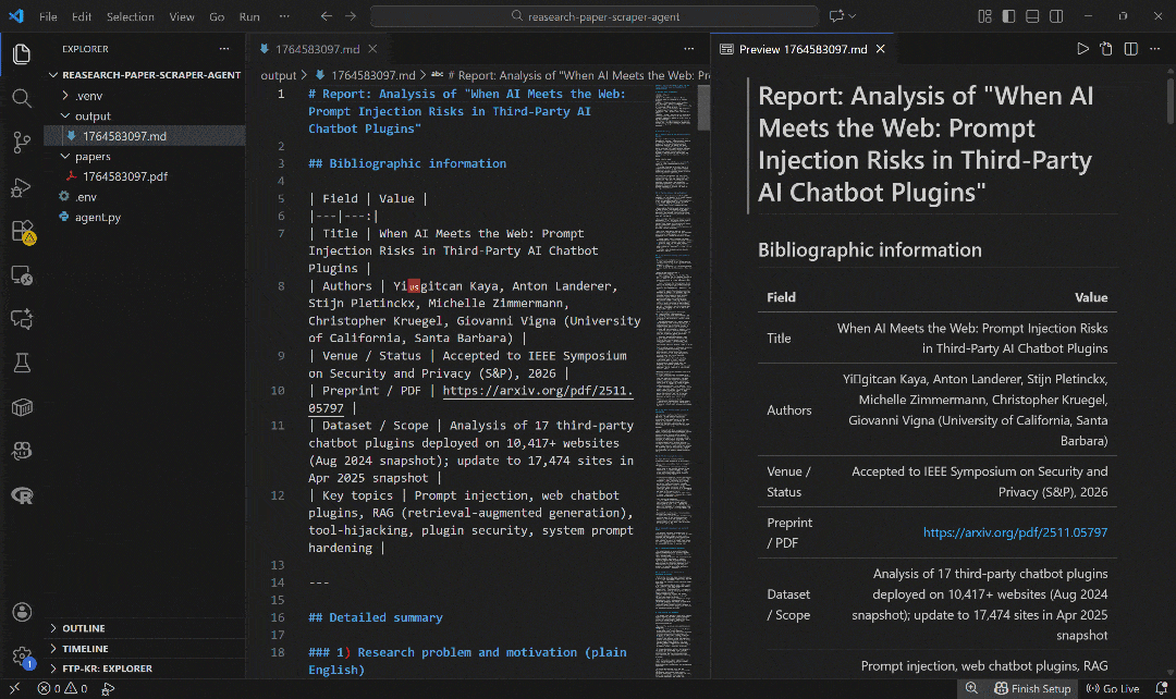 Instead of spending hours reading, such an AI agent produces a ready-to-use Markdown report in minutes. This is perfect for studying, referencing, or plugging into your projects.