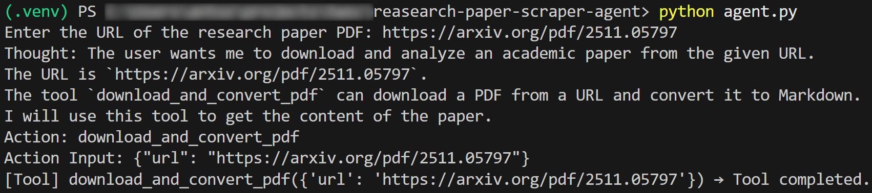 https://arxiv.org/pdf/2511.05797Paste the URL and press Enter. The script will pass it to the ReAct agent, which will call the download_and_convert_pdf tool as expected: