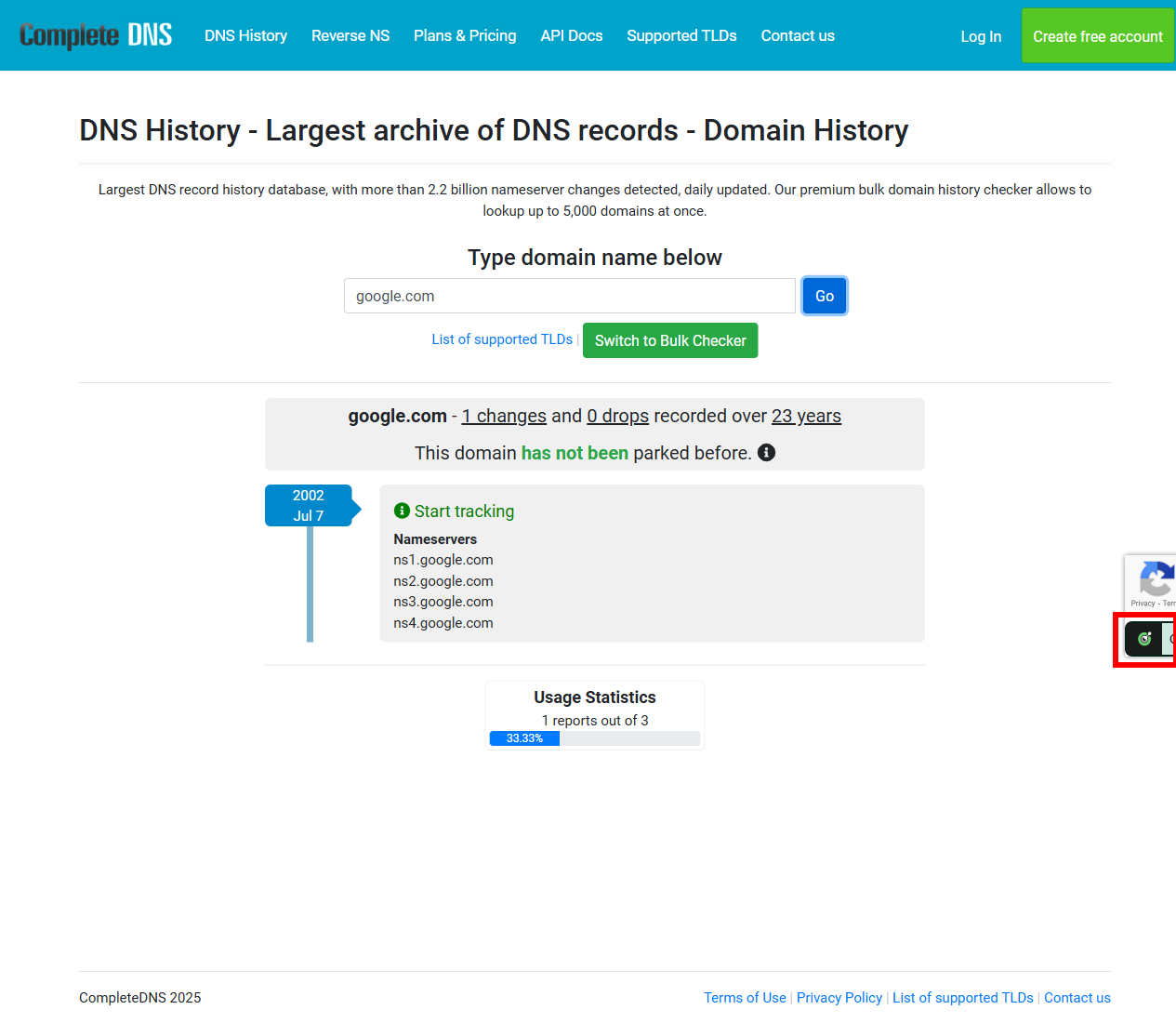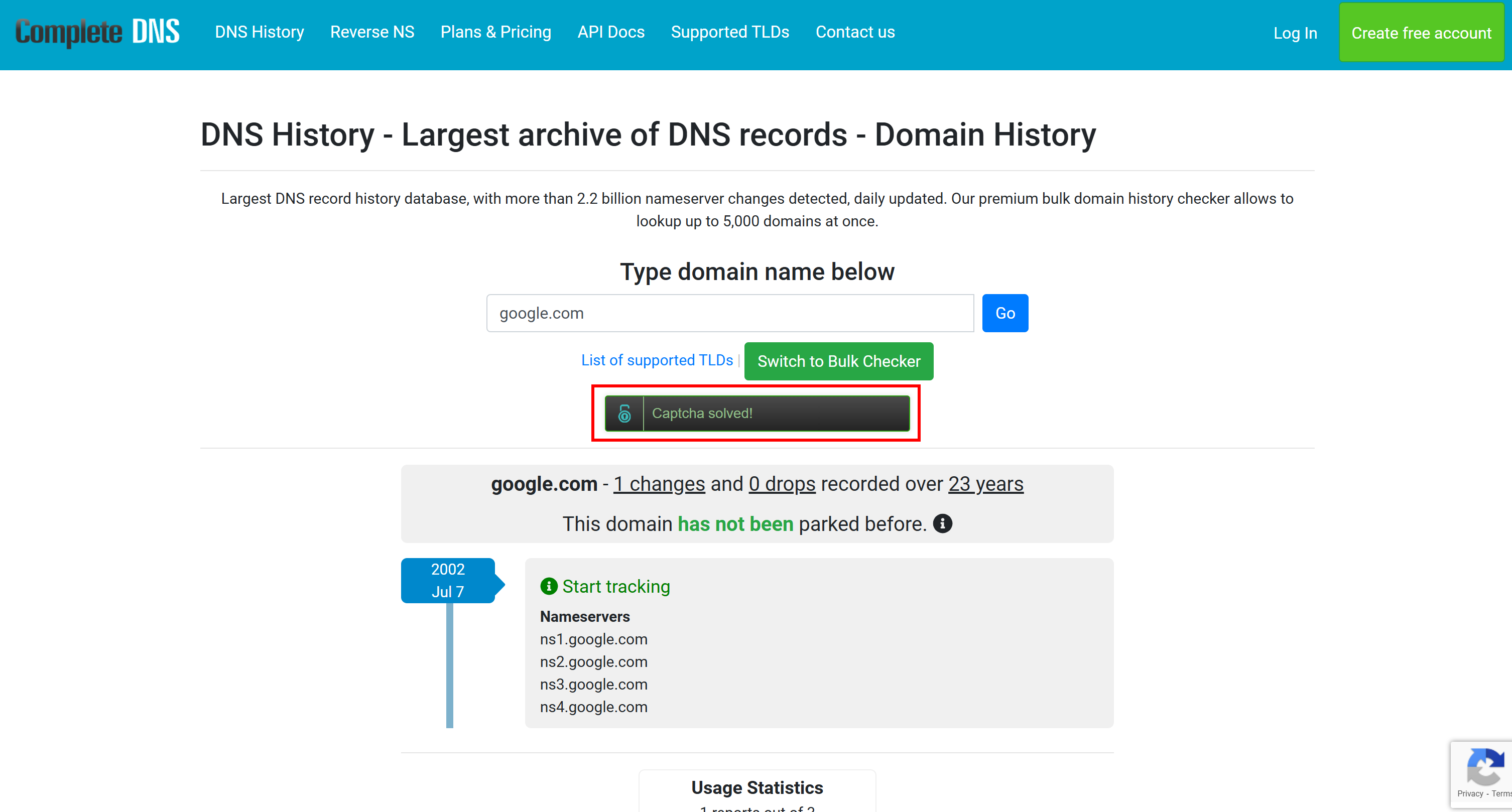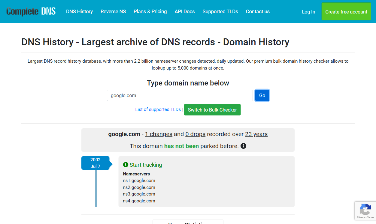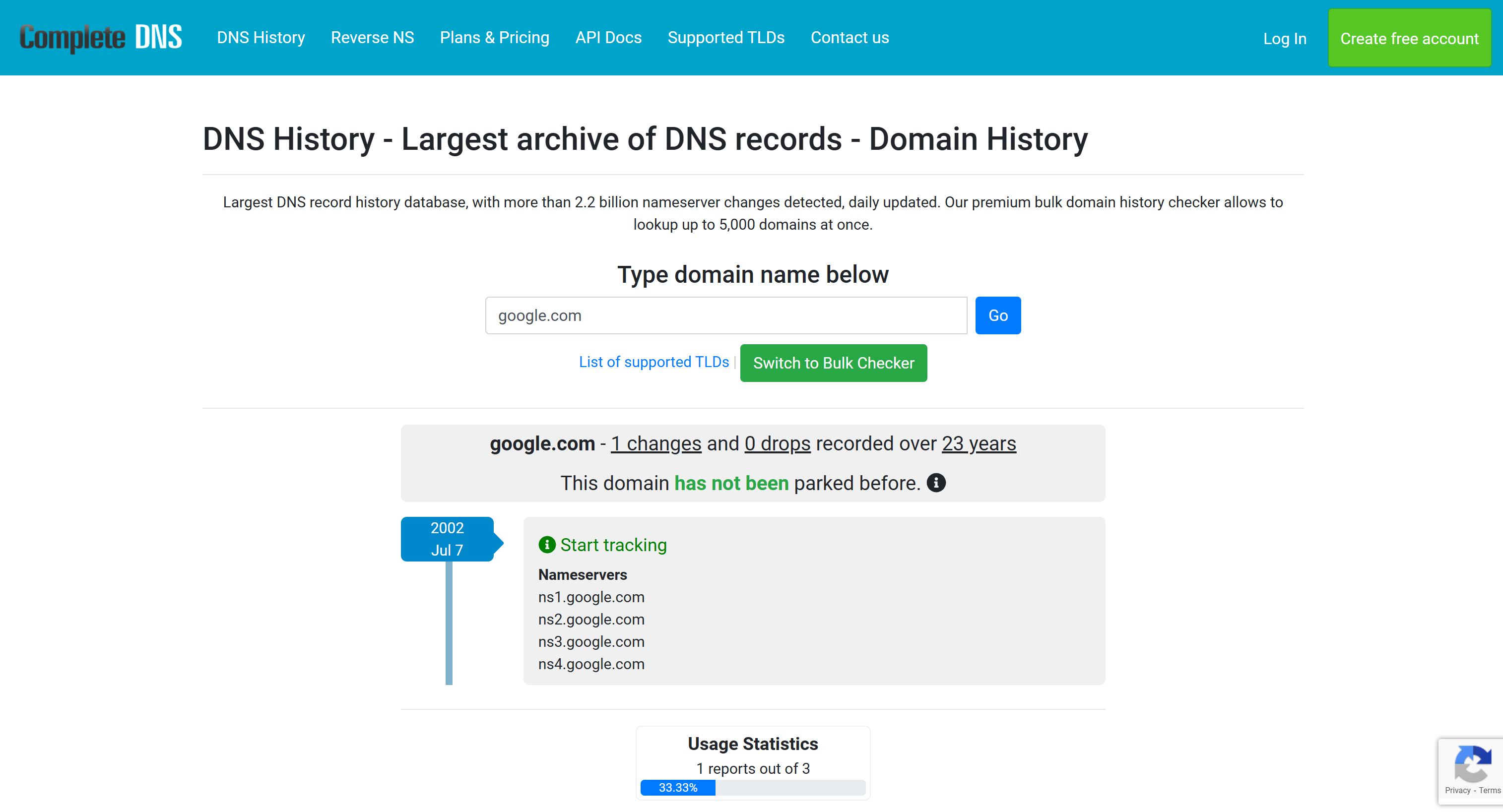Go to https://completedns.com/dns-history/ and submit the domain google.com, to extract the history of its DNS