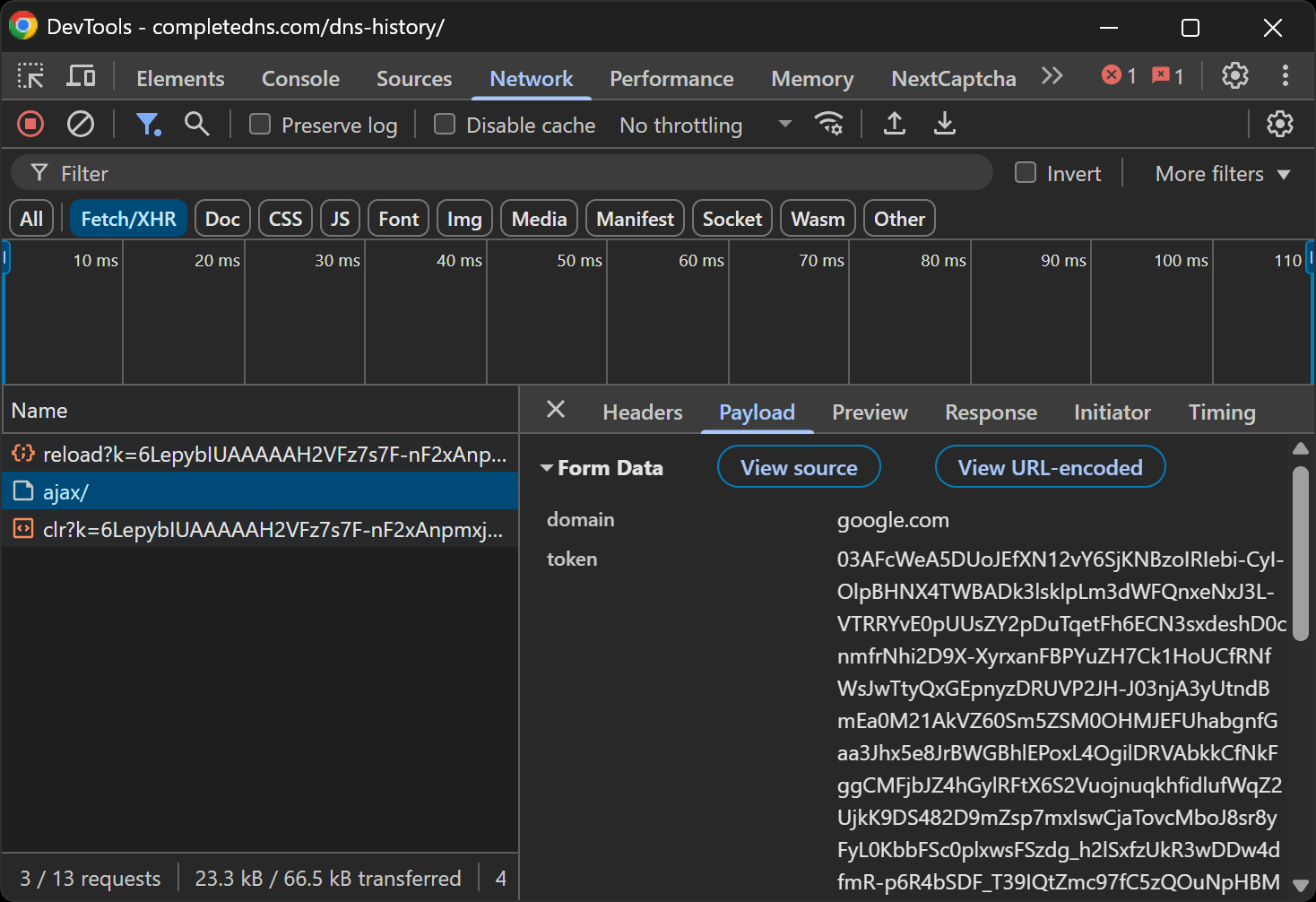 In the “Network” section, you’ll see that the page makes an AJAX request to the https://completedns.com/dns-history/ajax/ endpoint, using a payload like this: