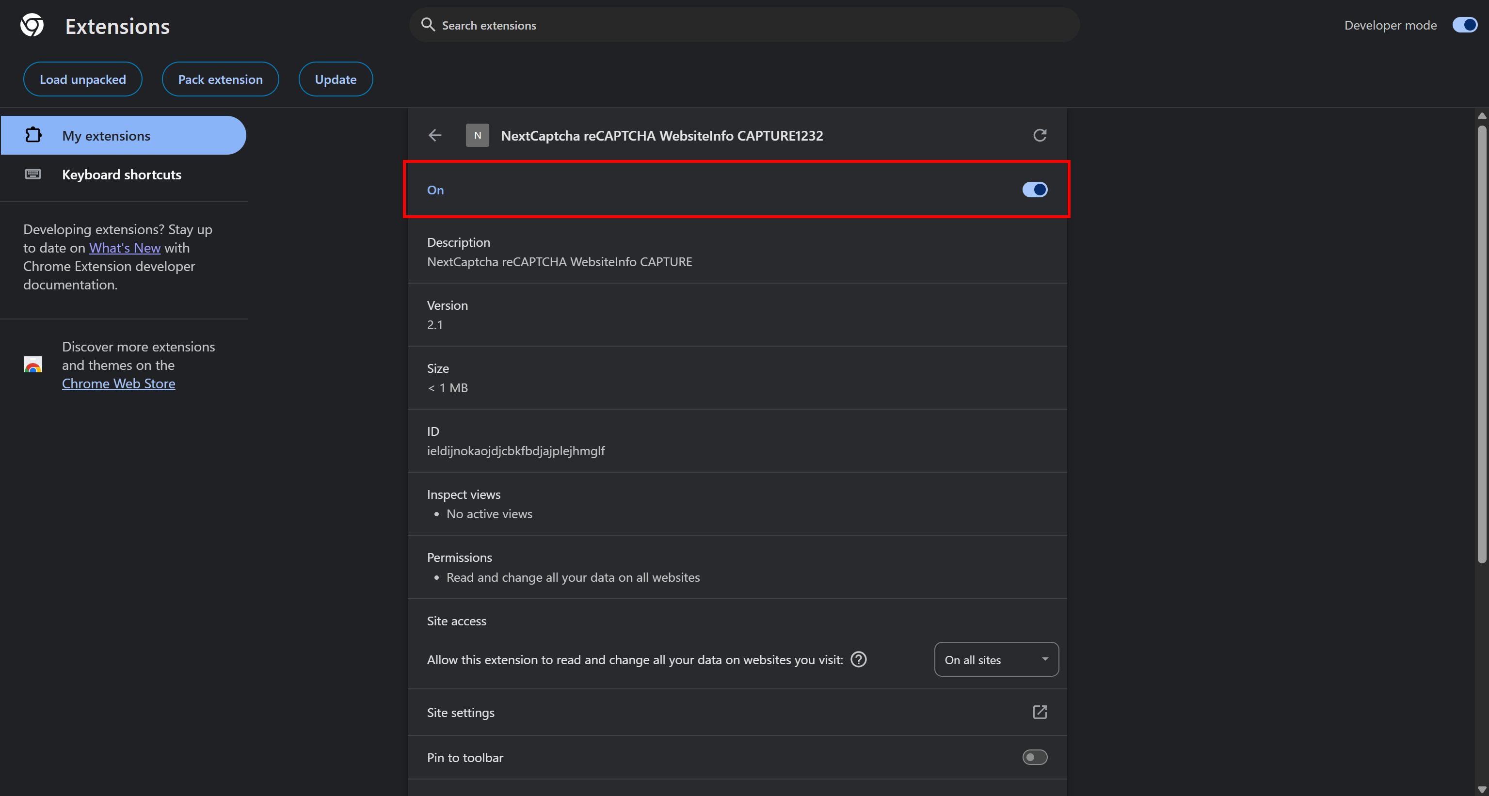 Start by creating a NextCaptcha account, buying some credits, and retrieving your API key. Then, install the NextCaptcha reCAPTCHA WebsiteInfo CAPTURE extension as explained in the official guide. Make sure it is enabled in your browser (Chrome, in my case):
