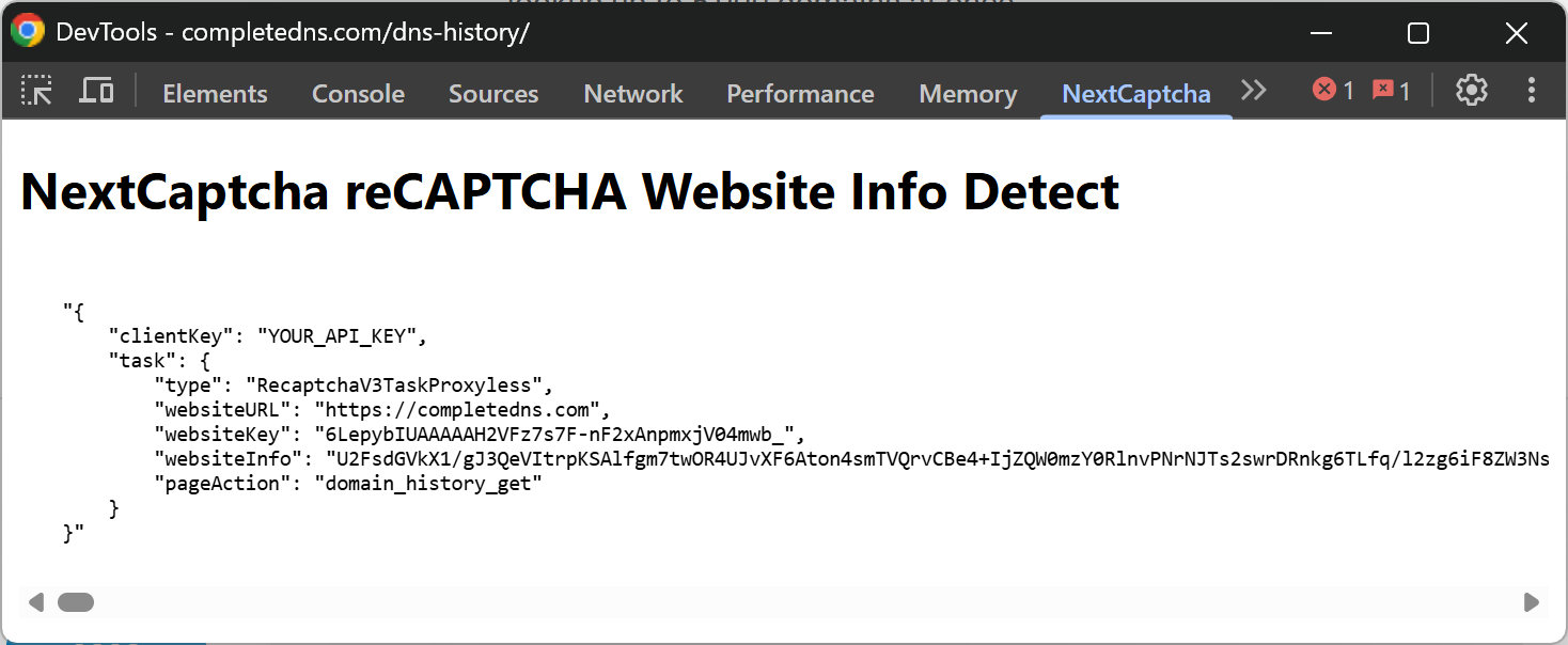 Specifically, that JSON string is the payload you need to send to the NextCaptcha APIs (after replacing clientKey with your actual NextCaptcha API key, of course) in order to programmatically replicate the reCAPTCHA v3-protected action (which is the call to the https://completedns.com/dns-history/ajax/ endpoint seen earlier).