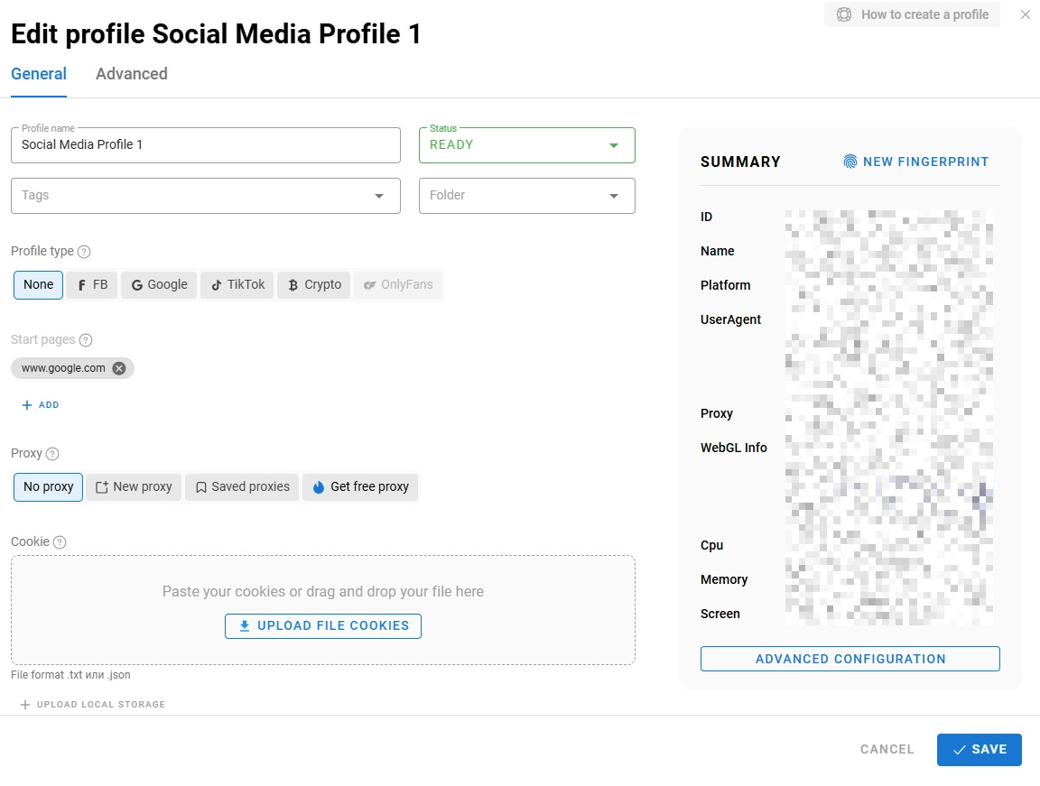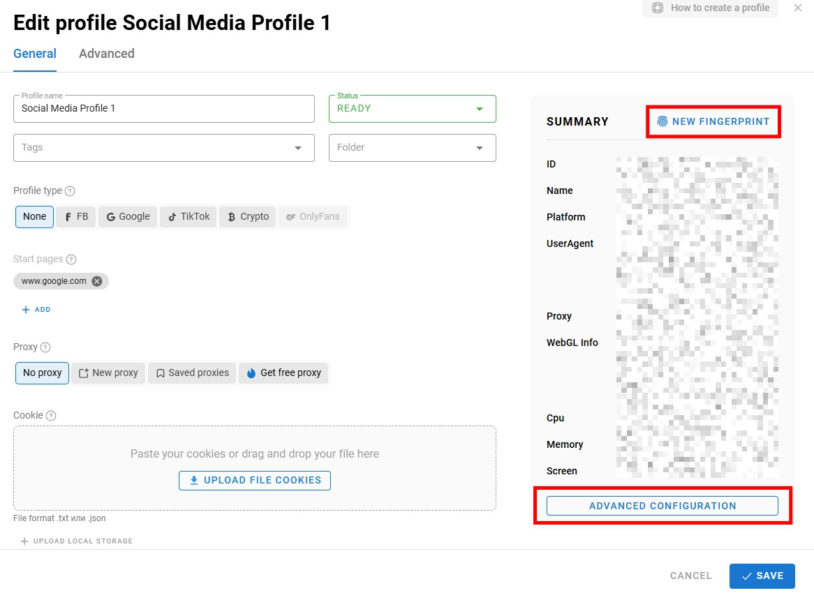 Profiles are the core of Dolphin{anty}. This is where, for example, you can change the fingerprinting for your anti-detect strategies. To do so, you only need to click on NEW FINGERPRINT, and the tool will change all the fingerprinting data for you. And if the standard fingerprinting is not sufficient, you can manage advanced configurations: