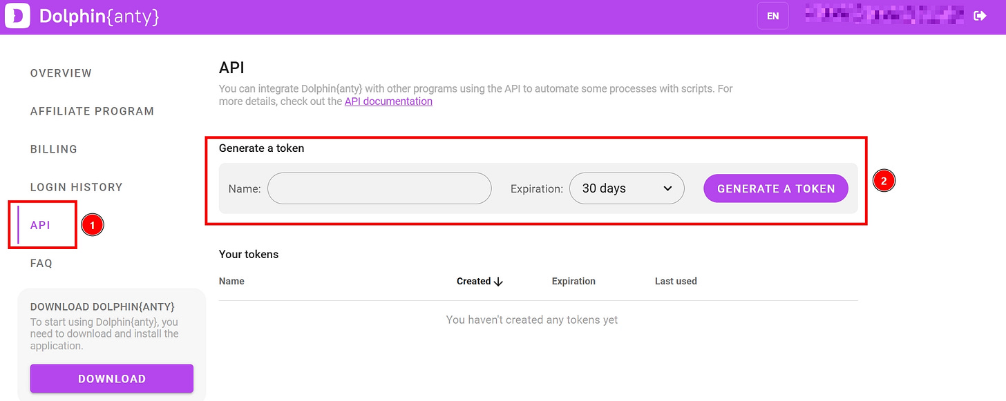 Before using Dolphin{anty} via code, you have to create an API key. To do so, navigate through the API panel in the web app: