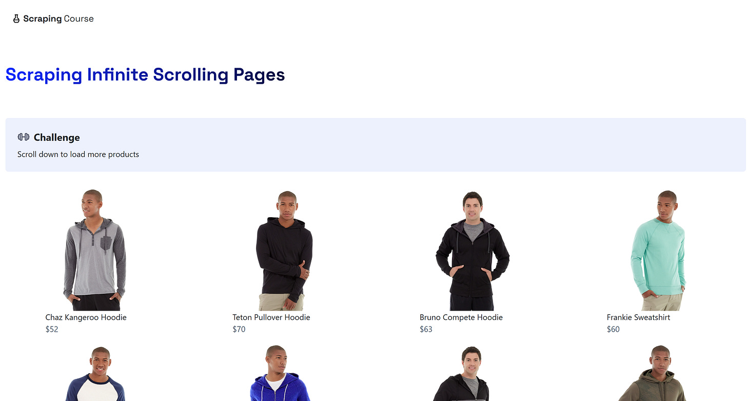 In this guided section, I’ll teach you how to scrape data from a site that uses infinite scrolling. Again, the target page will be ScrapingCourse's Infinite Scrolling page: