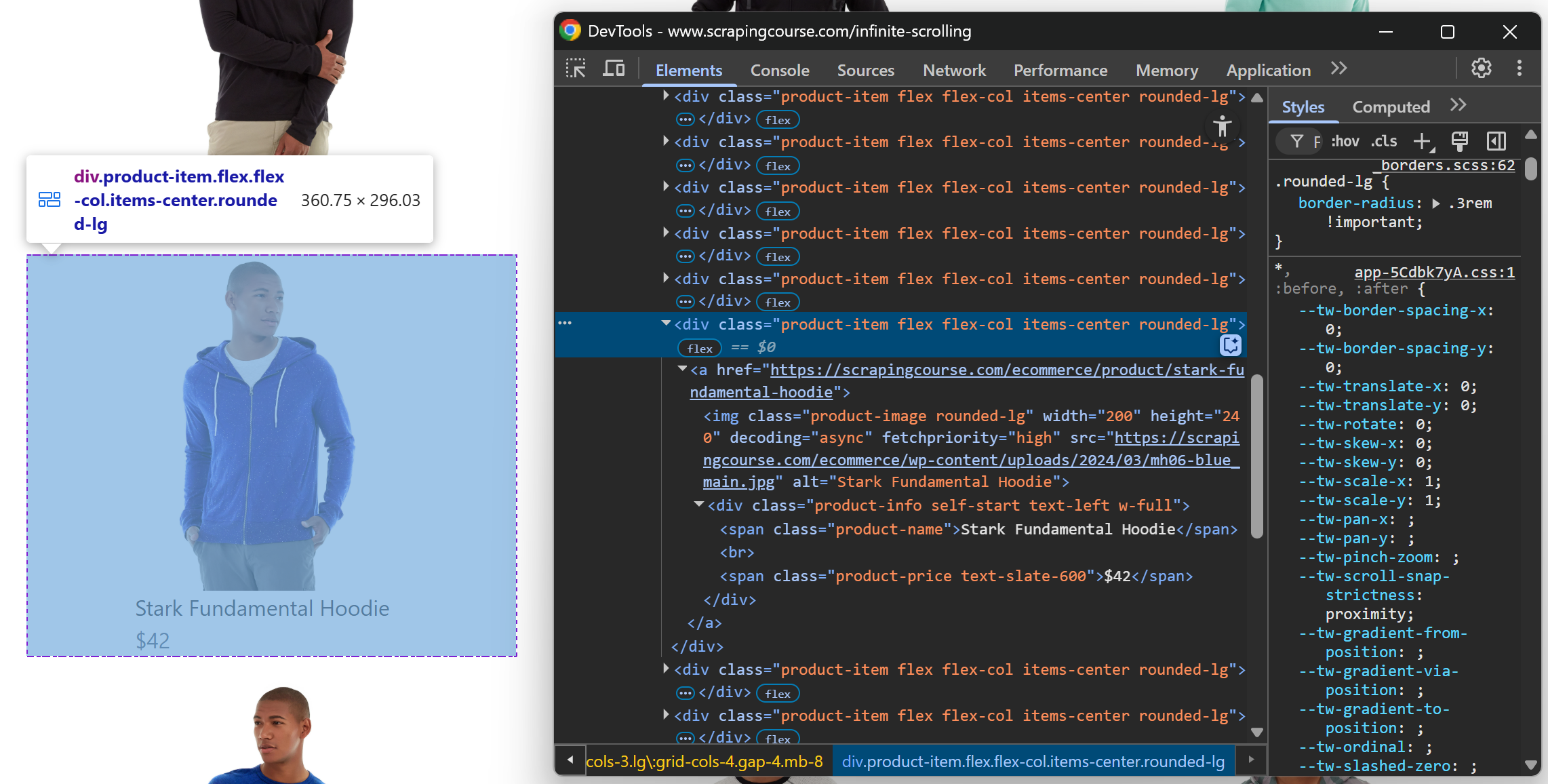Now that you’re sure all product elements are on the page, prepare to scrape them all. Start by inspecting a single product element to understand how to define the selector and extract the data: