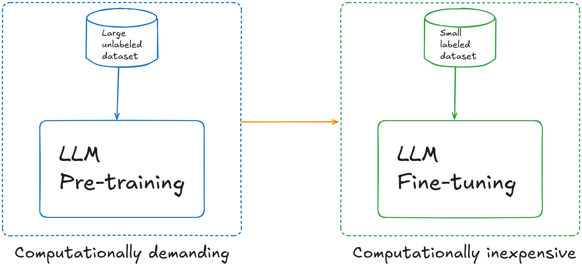 Note that, while the image above says that fine-tuning is “computationally inexpensive”, this is only compared to pre-training. In fact, fine-tuning can be very expensive, depending on the model you want to fine-tune (particularly, its total number of parameters) and on the dataset you have. Also, somehow the actual expense comes from having a labeled dataset you can actually use for fine-tuning. This is why you can often get your fine-tuning dataset via web scraping.