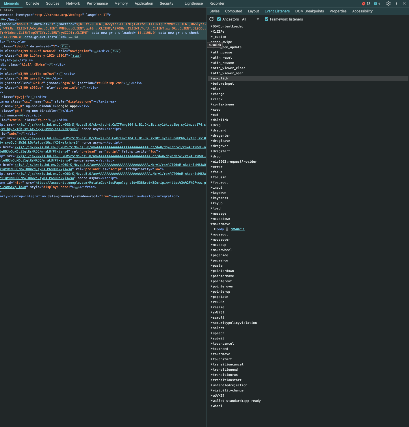 This is the home page of Google.com. Inside the tab Elements, we can find a list of event listeners active on that page. We can see that every mouse movement, click with any button, and keypress on the keyboard is collected, I’m assuming in order to collect data to use for improving the page usability.