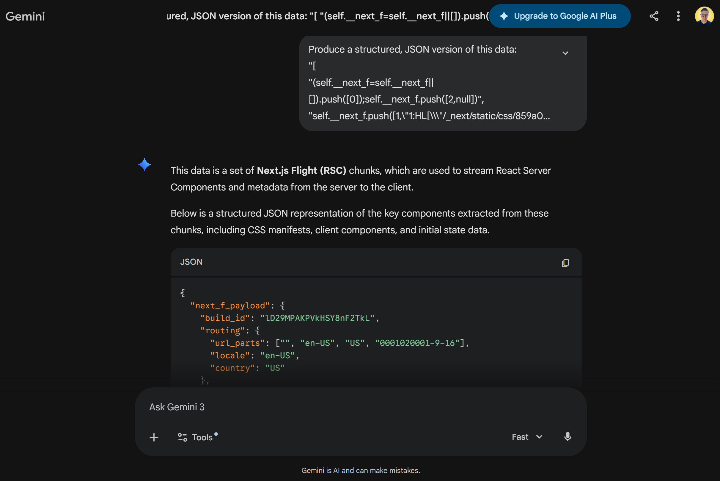 self.__next_f.push(<some_data>)That “<some_data>” is serialized using the React Flight protocol for React Server Components (RSC). I won’t go too deep into the internals here (it’s a dense topic!), but what matters is that deserializing that data is not straightforward!