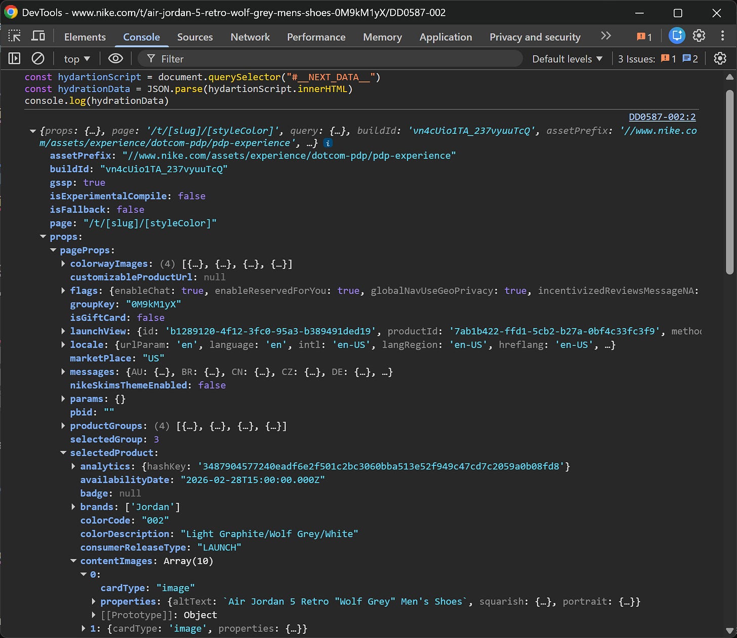 That’s exactly why hydration matters for scraping. Instead of parsing the DOM or simulating user interactions through browser automation, you can extract the structured data that React itself uses to hydrate the page.