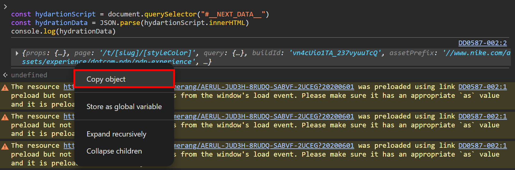 If you want to store the JSON hydration object, just right-click the object in the Console and select the “Copy object” option: