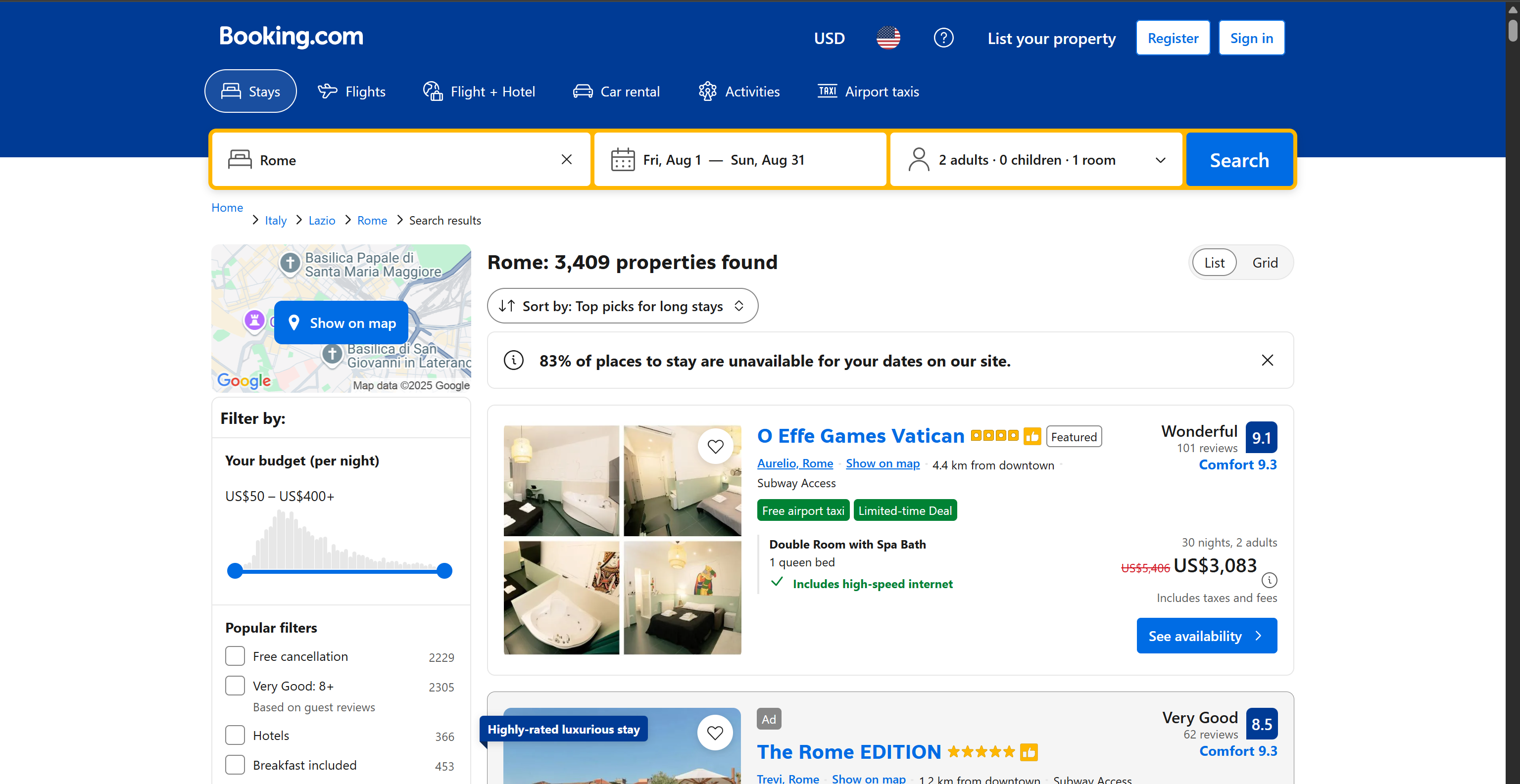 booking_url = "https://www.booking.com/searchresults.html?ss=Rome%2C+Lazio%2C+Italy&efdco=1&label=gen173nr-1FCAQoggJCC3NlYXJjaF9yb21lSDNYBGinAogBAZgBMbgBF8gBDNgBAegBAfgBA4gCAagCA7gCgJfpwwbAAgHSAiRjNDA1NjNhMS1kYzQ2LTQ3MjYtYjc0YS1kZGM0NjRjYTQyZWHYAgXgAgE&sid=02599cbc4cb59fd631f047d5e547b490&aid=304142&lang=en-us&sb=1&src_elem=sb&src=index&dest_id=-126693&dest_type=city&ac_position=0&ac_click_type=b&ac_langcode=en&ac_suggestion_list_length=5&search_selected=true&search_pageview_id=127e60d050da05c0&ac_meta=GhAxMjdlNjBkMDUwZGEwNWMwIAAoATICZW46BHJvbWVAAEoAUAA%3D&checkin=2025-08-01&checkout=2025-08-31&group_adults=2&no_rooms=1&group_children=0"