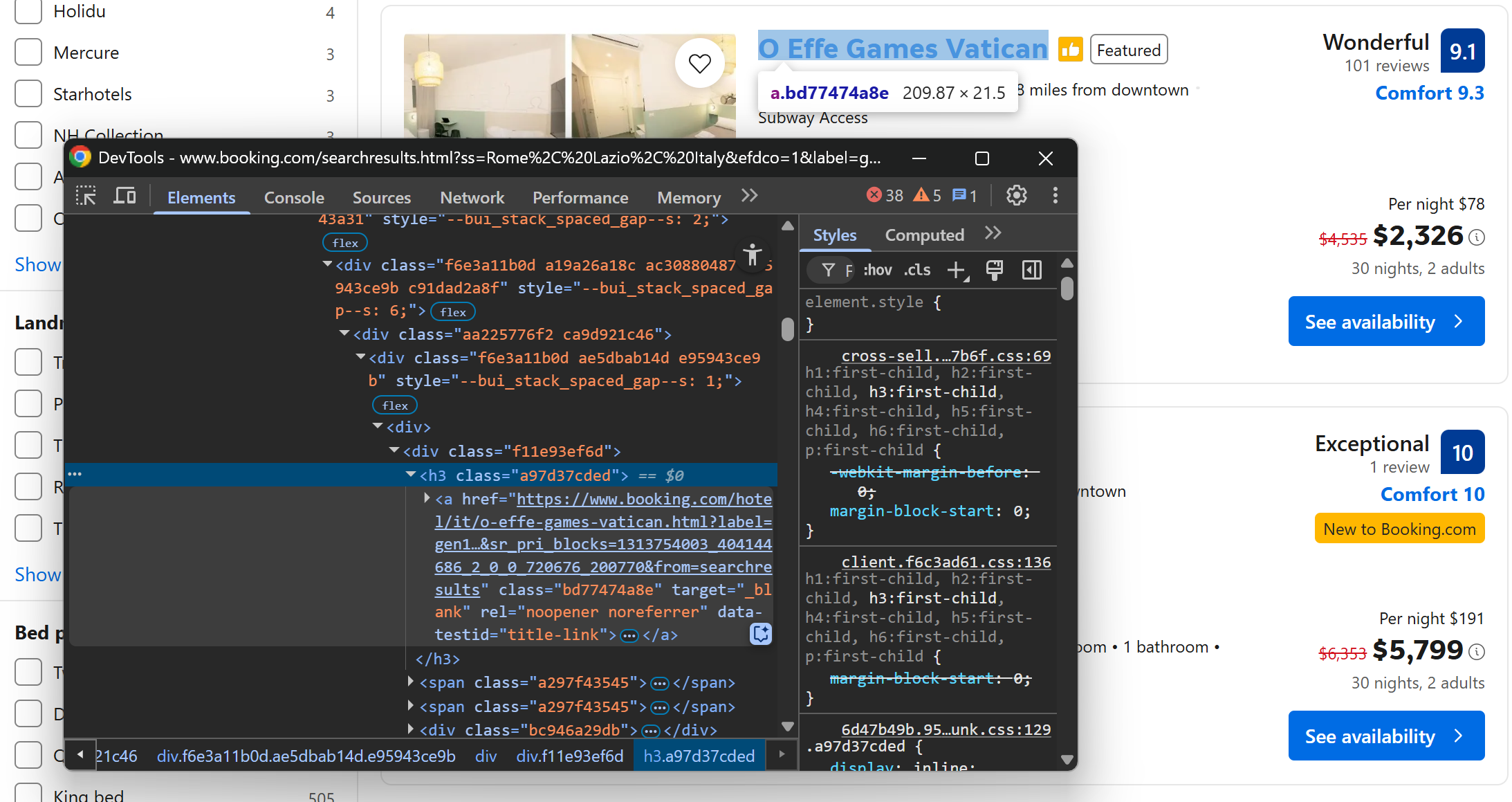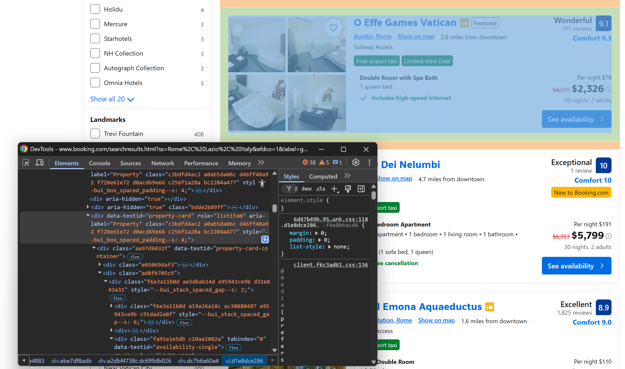 As you can see, the class names used by Booking.com appear to be randomly generated. That’s quite common and is often done to deter scrapers (and avoid caching issues, since these classes change at each release because they’re generated at deploy time).