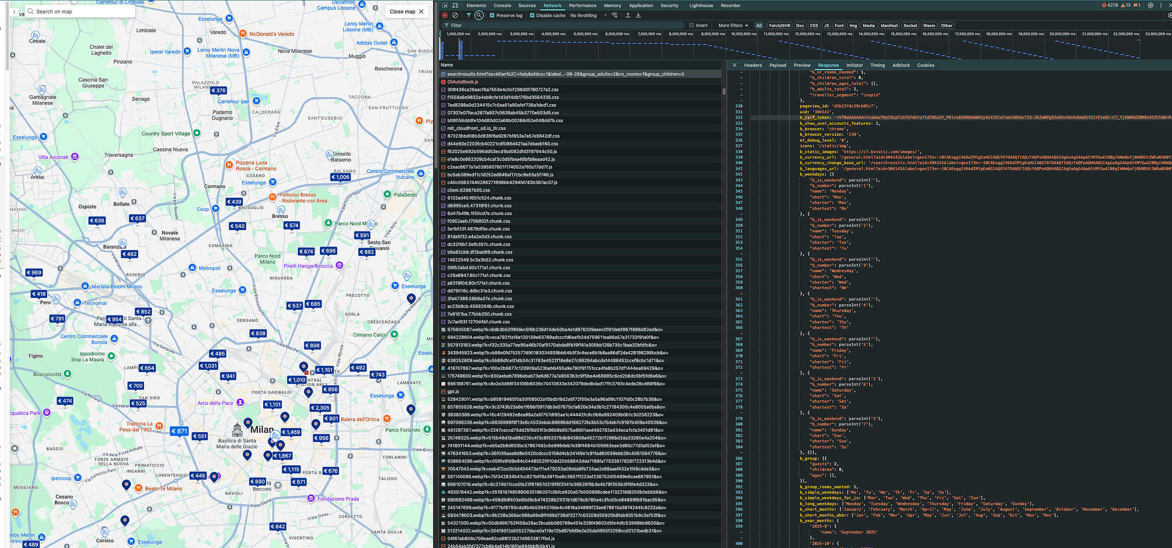 Access to Hidden Data: Sometimes the internal API provides data that might not be directly visible in the initial HTML. For example, Booking’s GraphQL can return detailed pricing, availability, or map coordinates without additional page loads. You can take advantage of these endpoints to obtain more comprehensive information (such as all prices for a specific date range) that would otherwise require additional steps with HTML scraping.