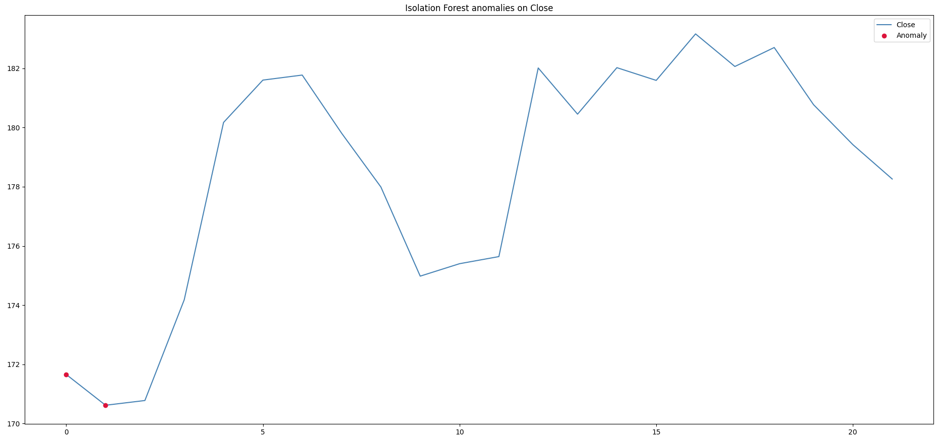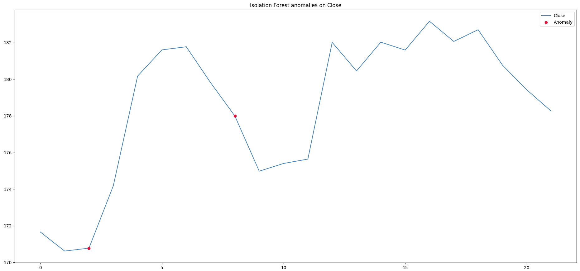 Isolation Forest assigns each point an “isolation score” by randomly splitting the data and measuring how quickly a point gets isolated in those random trees. In the above code, contamination=0.05 says: “treat about 5% of points as anomalies.” It is used only to set the decision threshold after the model computes scores.
