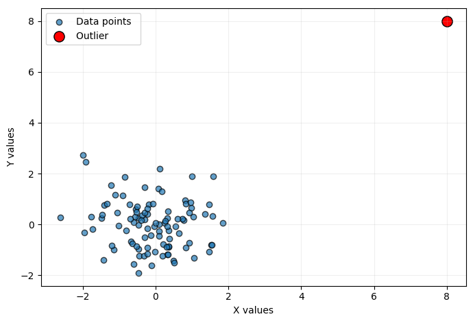 Outliers: An outlier is a data point that lies far from the rest of the data. They are often considered statistical noise and can be the result of data entry errors, measurement errors, or natural variations within the data distribution.