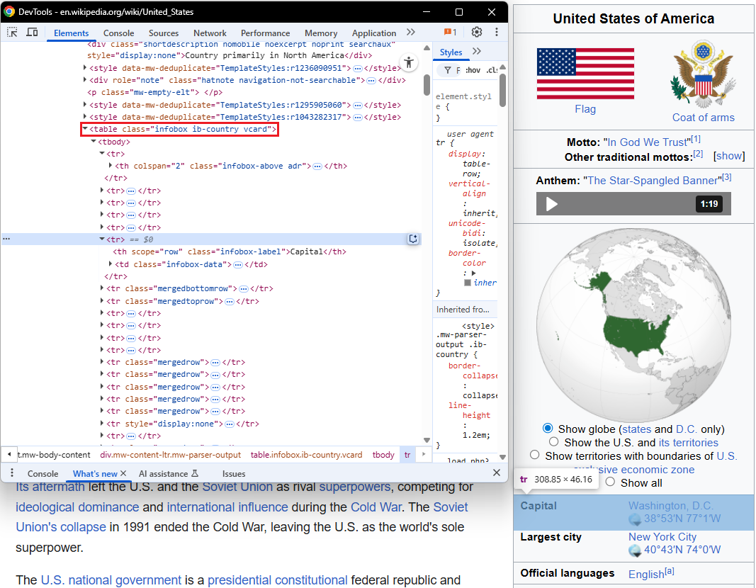 As the image shows, the table reporting some data about the US has a nested structure, which is hard to scrape. In such cases, it’s difficult to just point to the whole table—<table class=”infobox ib-country vcard”>—to extract all the selectors in a simple way. You’d need to point to all the selectors of the data you need to scrape, developing a complex logic.