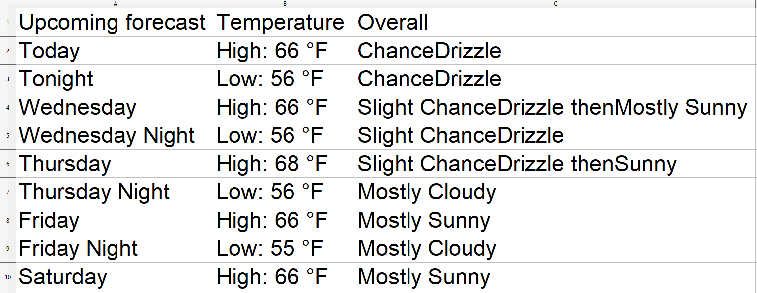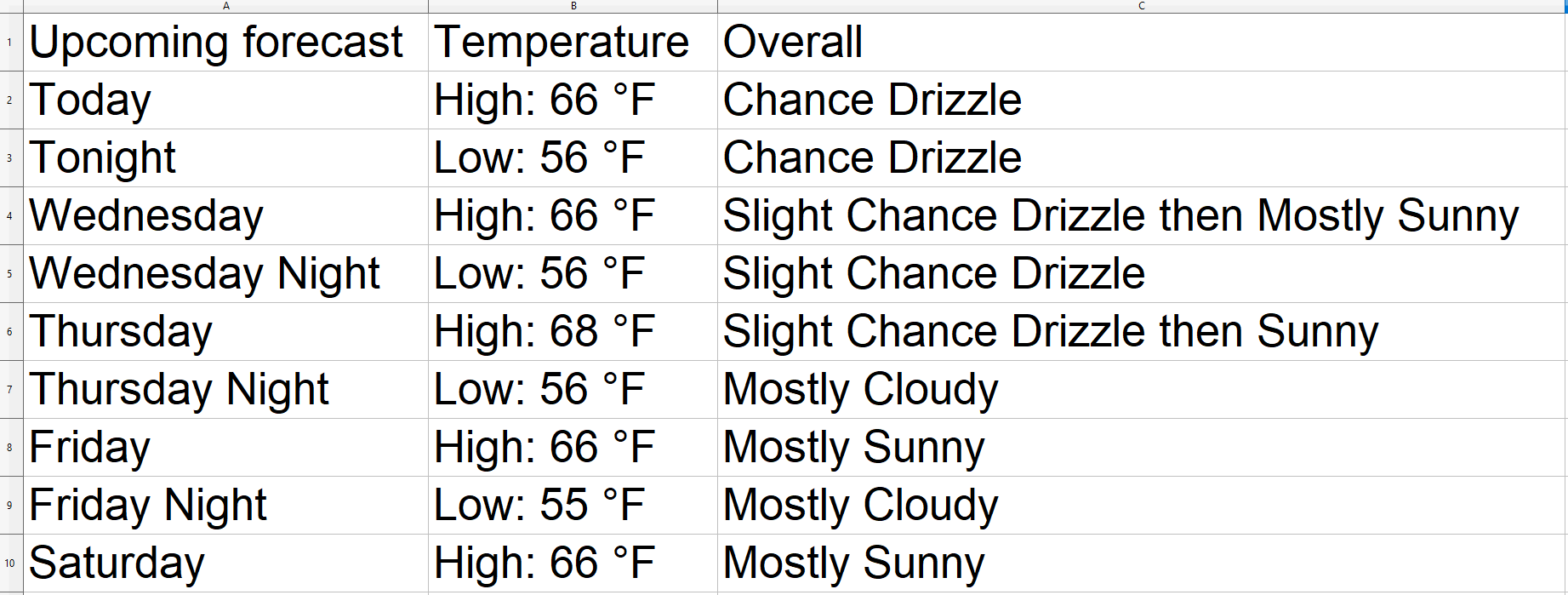 headers = ["Upcoming forecast", "Temperature", "Overall"]