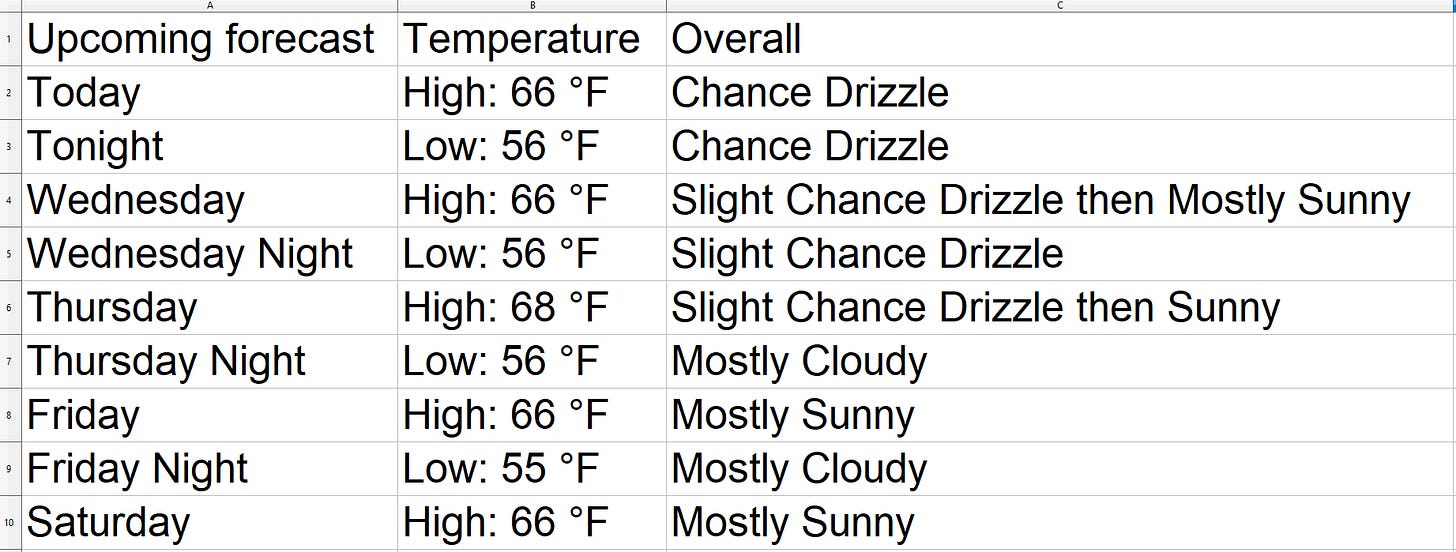 "extract all the forecast periods, their temperature, and a short weather description. "
