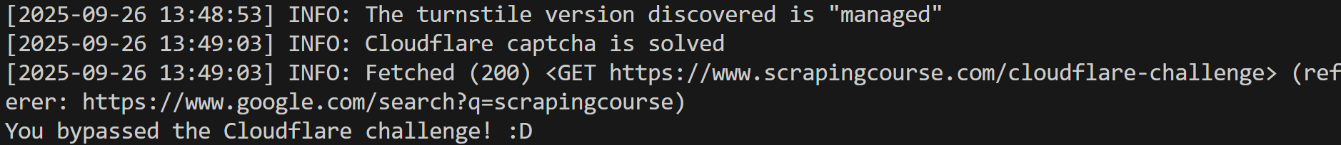 Note that the message “You bypassed the Cloudflare challenge! :D” was scraped from the page, showing that the Scrapling bot was actually able to bypass the Cloudflare Turnstile (even in headless mode, which isn’t so easy). Fantastic!
