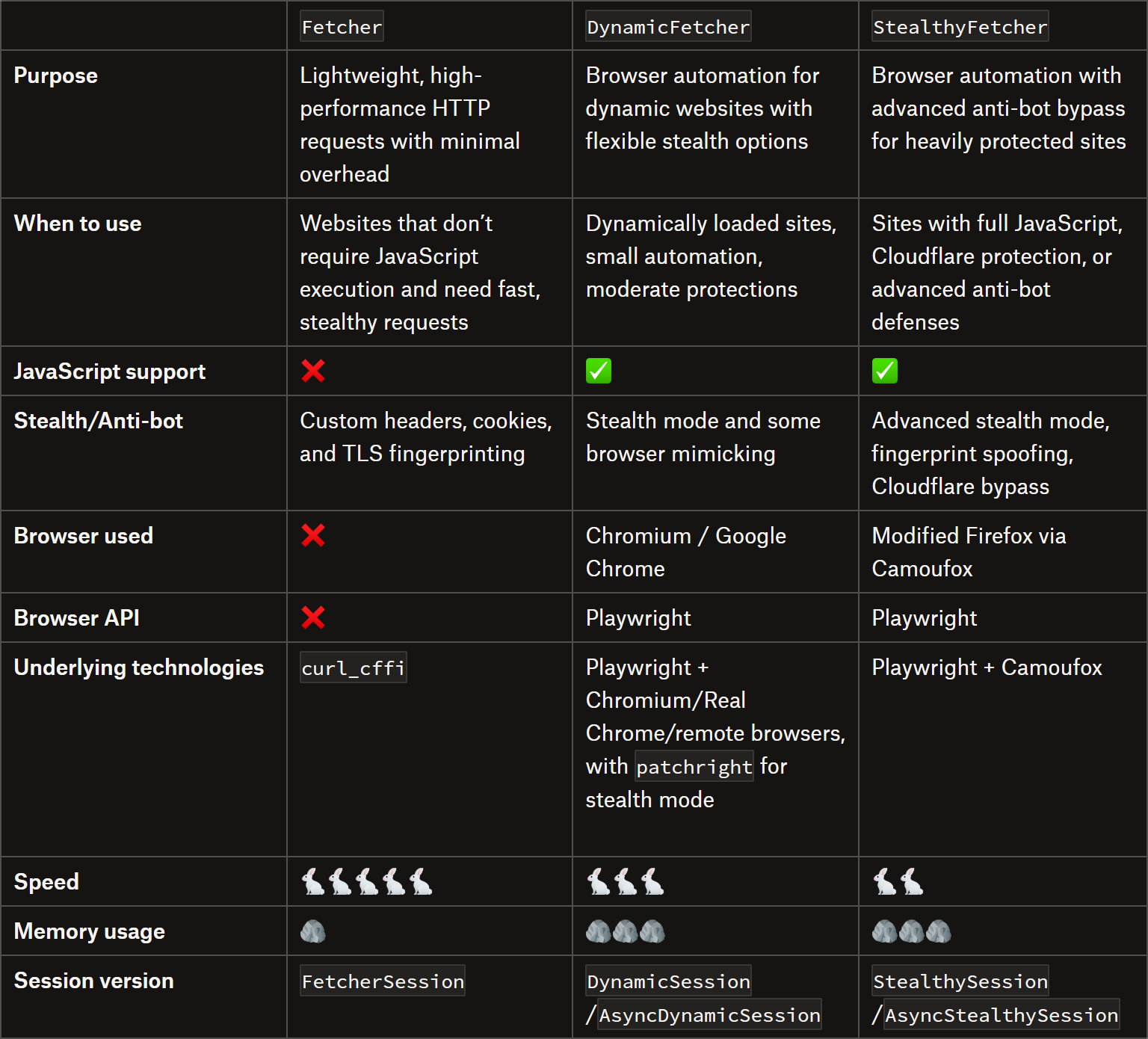 Below are the three main Scrapling fetchers: