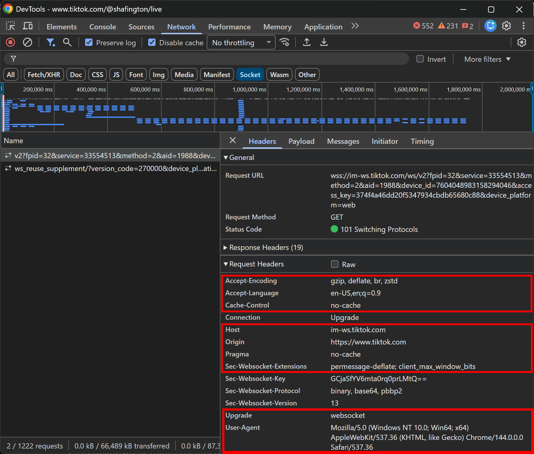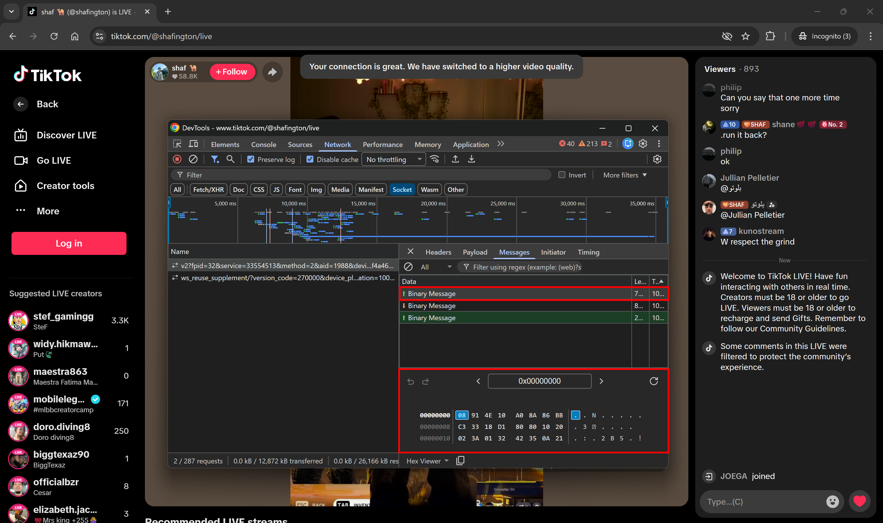 For instance, TikTok LIVE pages use WebSockets to stream updates (e.g., chat messages, view counters, and other statistics) in binary format:
