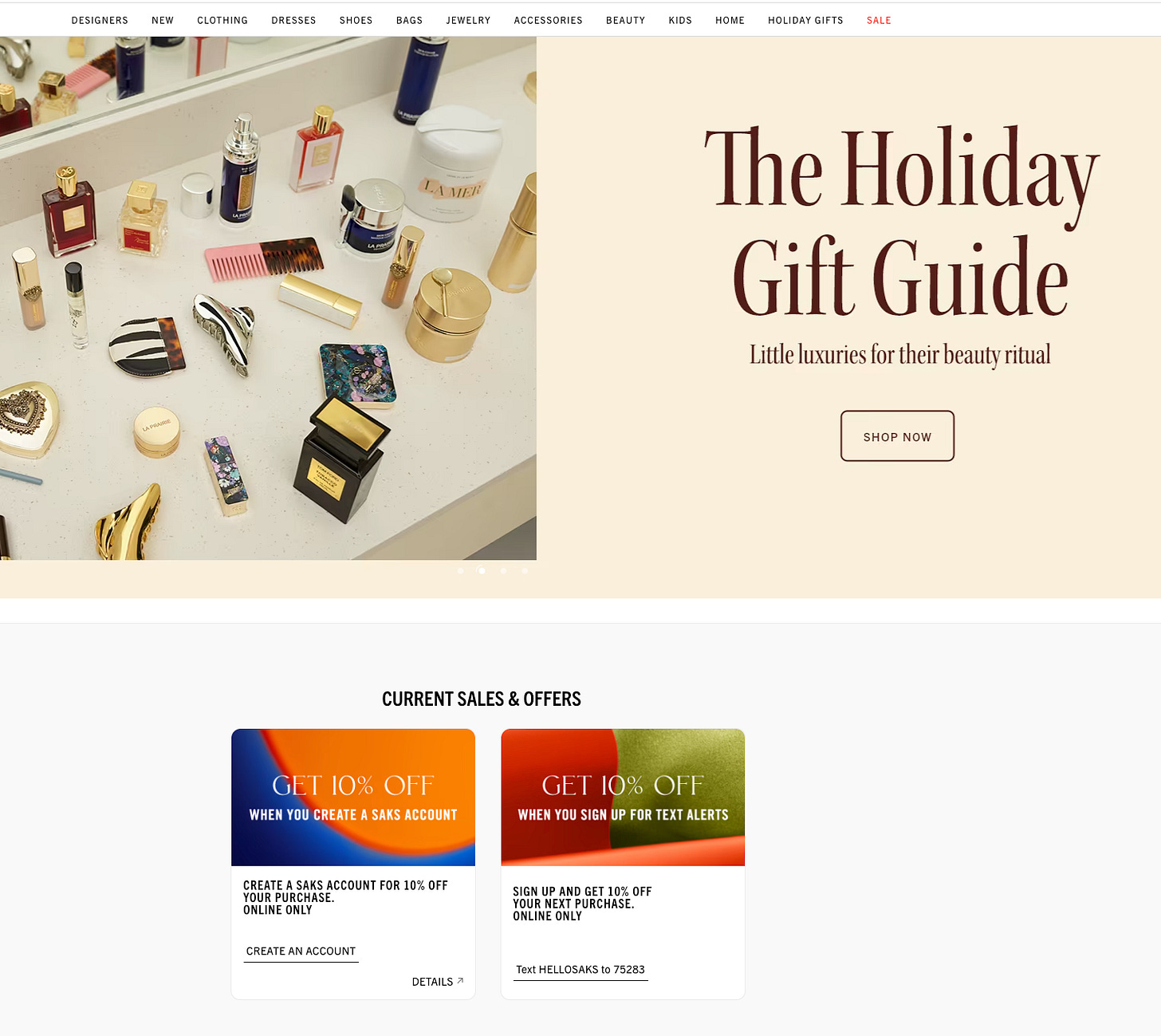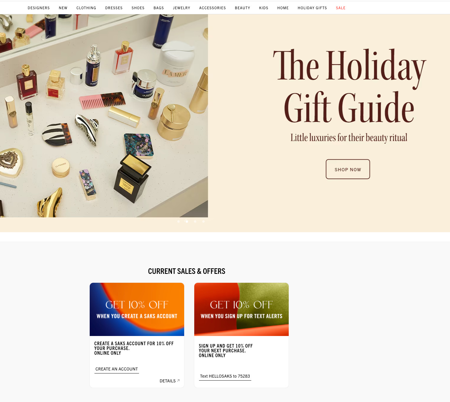**Email sign‑up bonus:** A pop‑up overlay invites visitors to join the Saks Fifth Avenue mailing list. It promises “Receive 10% off your next purchase” if you submit your email, with the note that the offer arrives via email within about 24 hours!**Account creation incentive:** Under “Current Sales & Offers” there’s a card advertising “Get 10 % off” when you create a Saks account and use code **ACCOUNTSF**!**Text‑alert signup bonus:** Next to that, a second card offers “Get 10 % off when you sign up for text alerts” by texting “HELLOSAKS” to 75283**Holiday Gift Guide:** The hero banner promotes the “Holiday Gift Guide,” but that’s a curated product selection rather than a discount.**Free shipping offer:** A rotating banner at the top of the page advertises “Free shipping on $300+ with code FREESHIP” and mentions “Earn rewards with a Saks credit card.” Another slide mentions a chance to win a $1,500 gift card (details not fully visible).