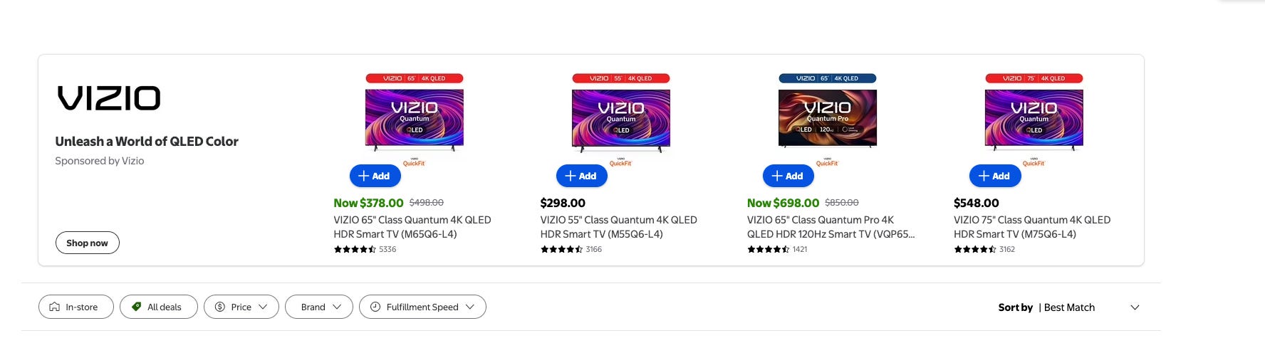 and ChatGPT replied as expected:In the refreshed page, the **promoted (advertising) section** at the top of the Walmart search results is by **Vizio**.It displays **three sponsored Vizio TV models**, all part of their **Quantum and QLED HDR Smart TV** lineup: