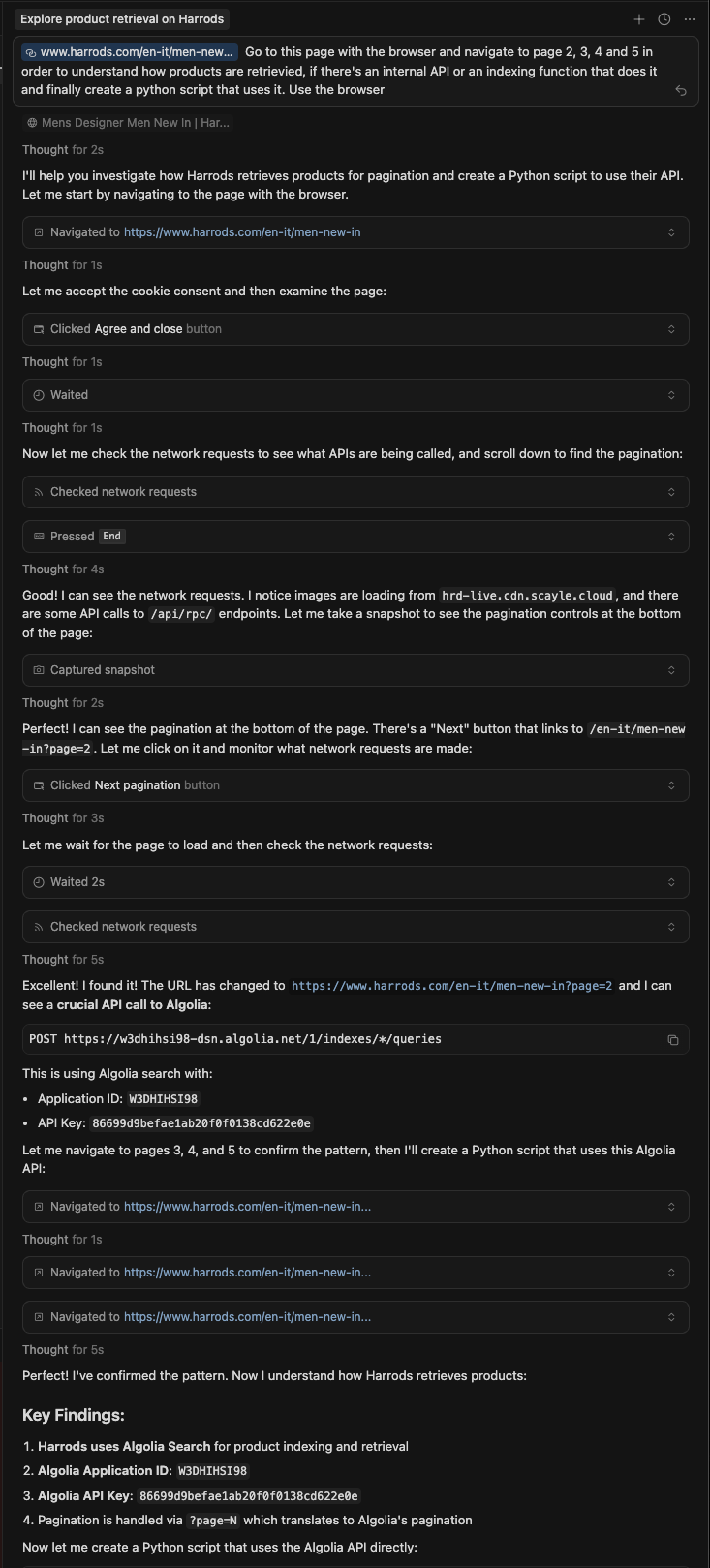 Let’s use Harrods.com as an example: that’s what happens when we ask Cursor (with Claude4.5) to open the https://www.harrods.com/en-it/men-new-in page, paginate until page 5, and in the meanwhile look for internal APIs for retrieving products.