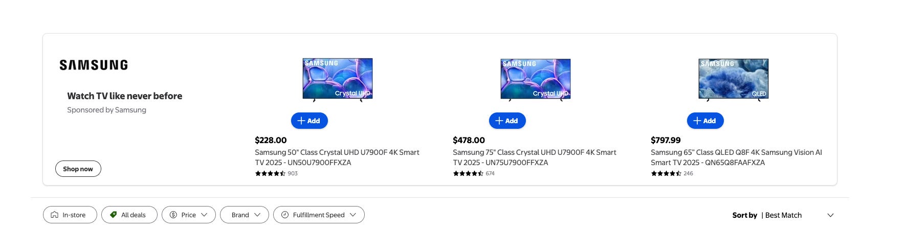 At the top of the Walmart search results page, before the product catalog appears, there’s a **sponsored advertising section by Samsung**.