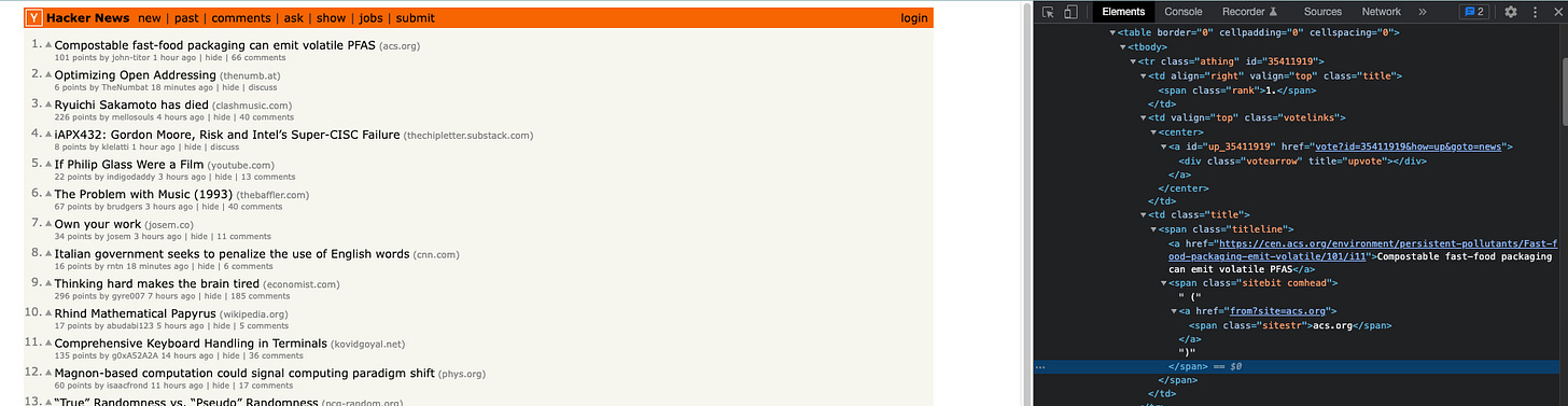 Let’s compare the syntax of XPATH and CSS selectors on the same page, in this case, Hacker News home page. Let’s say we want to locate the title of the first news ranked.